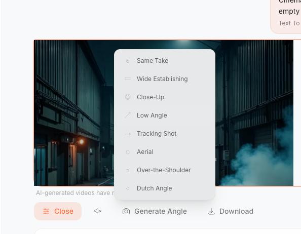 Just select a clip, pick your angle, and hit "Generate Angle" — the AI re-renders the scene from your chosen perspective. It's like having a drone, a steadicam, and a crane on set — without any of the gear.